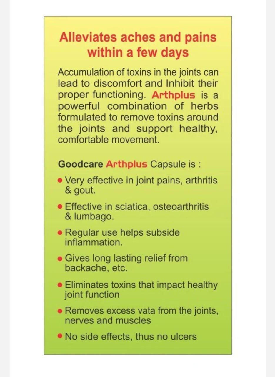 The treatment for Arthritis must aim to reduce joint pains, improves joint functions and helps the patient to lead a healthy life. Arthplus capsule is a powerful combination of Herbs formulated to remove toxins around the joints and support healthy, comfortable movement. It alleviates aches and pains within a few days.